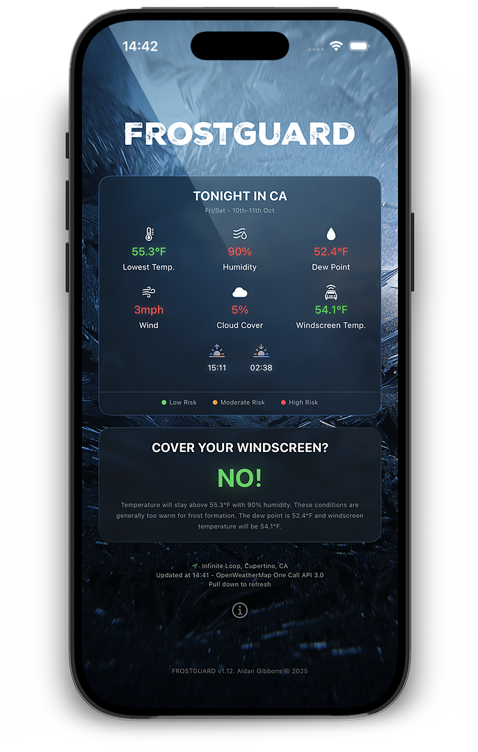 I designed the app in my free time, as a tool to help those who get caught out by frozen windscreens. From emergency responders & shift workers to ambulance/NHS staff, police, carers, farmers - the list goes on - it’s worth having this in your pocket. Please get in touch below with any bug reports or issues.